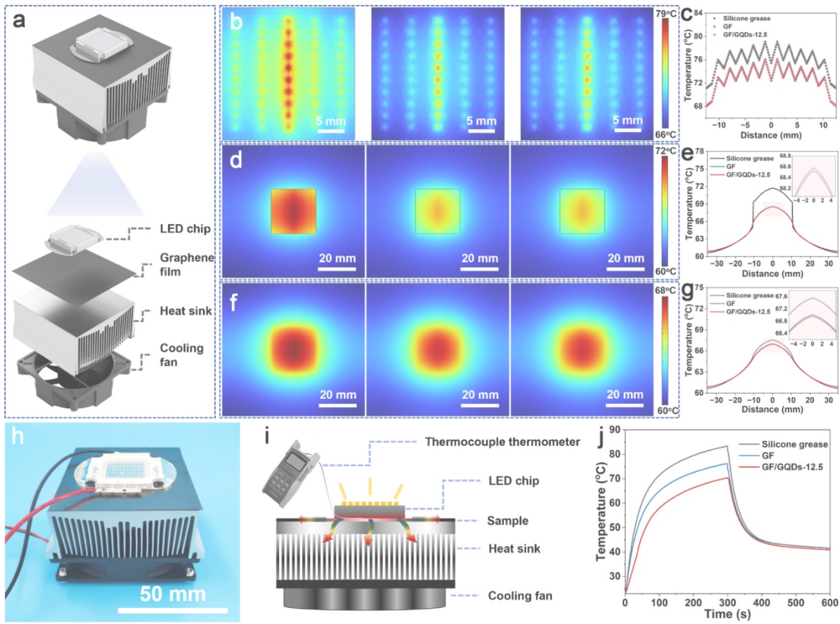 研究团队利用石墨烯量子点(GQDs)作为外部碳源,在高温石墨化过程中实现对石墨烯膜缺陷的修复。热还原过程中,小尺寸氧化石墨烯片为气体释放提供通道,而GQDs则作为外部碳源填充原子空位,促进缺陷修复并实现晶粒生长。当GQDs添加量为12.5 wt%时,膜缺陷修复效果最为显著,ID/IG值降至0.0073。除空位填补外,GQDs提供的额外碳源也促进了相邻石墨烯片层之间的晶粒融合与有序取向。缺陷降低与晶粒尺寸增大共同减少了声子-缺陷散射和声子-晶界散射,使石墨烯膜面内热导率达1633 W·m-1·K-1,相较于未添加GQDs的样品提升约10.8%。将其应用于50 W功率的LED散热,实测结果表明,使用高导热石墨烯膜可使运行300秒后的LED芯片降温达13℃。结合热仿真分析,高导热石墨烯膜使整个LED器件表面实现了更加均匀的温度分布,展现出卓越的热扩散能力。该研究通过引入石墨烯量子点作为“纳米焊料”,实现石墨烯膜的缺陷修复与晶粒生长协同调控,促进了宏观石墨烯膜中声子输运效率,获得了兼具低缺陷、高有序堆垛和高面内热导率的石墨烯膜,其在高功率LED散热中展现出优越的散热性能。为高性能石墨烯热管理材料的设计提供了微观结构调控思路,有望助力解决智能手机、数据中心、功率电子模块等应用场景下的“热失效”问题。