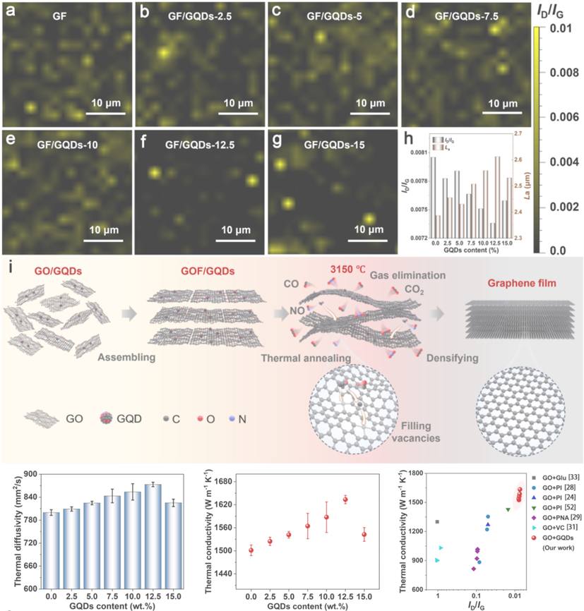 图2 GQDs辅助热处理石墨烯膜缺陷修复及导热性能结果