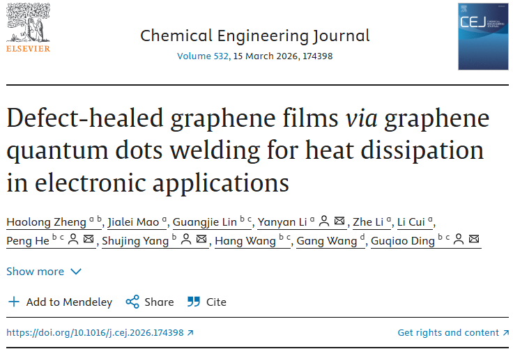 相关研究成果以“Defect-healed graphene films via graphene quantum dots welding for heat dissipation in electronic applications”为题于2026年3月15日发表于国际期刊《Chemical Engineering Journal》(一区Top,IF=13.2)。嘉兴大学为第一单位,文章第一作者为嘉兴大学青年教师郑豪龙博士,通讯作者是嘉兴大学材料与纺织工程学院李艳艳副教授,中国科学院上海微系统与信息技术研究所杨舒景博士、何朋副研究员和丁古巧研究员。该研究得到国家自然科学基金项目(52303126, 52572057)、浙江省自然科学基金(LQN26E020029)、浙江省科技计划项目(2025ZY01057)、嘉兴市公益研究项目(2024AY30003)及嘉兴大学科研启动基金(70525054)的资助。